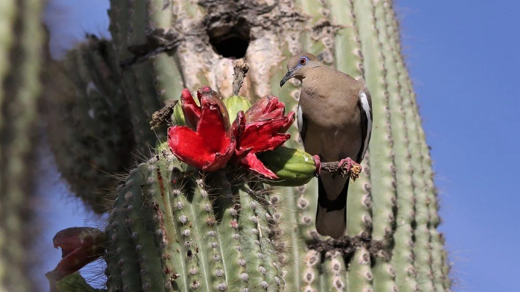 Interestingly enough, one of the primary pollinators, the white winged dove (Zenaida asiatica), also consumes the fruit so much that few seeds escape consumption. But they also play a key role in seed distribution as not all the seeds will be eaten. For desert white-winged doves, 60% or more of their diet is saguaro-based. Their breeding cycle coincides with that of the saguaro blooming. Certain species of Sonoran Desert ants also depend heavily on saguaro fruits.