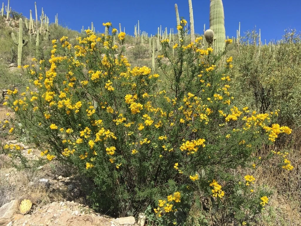 Spiny shrub growing about 4’ high and 6’ wide. Bright yellow flowers in spring into early summer. The spiny branches are coated in tubular hairs which help protect it from hot desert air. The fruit is a cylindrical pod, a little over 3/4" long, which falls off and contains a few seeds.