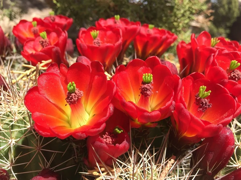 A number of varieties of this highly variable cactus species are known, but not all are universally recognized. Either way this is one of the most attractive hedgehog cacti. This species grows in clumps as much as 3-4 feet across but usually smaller. The bright red-orange flowers often cover the whole plant, which is cylindrical and low-growing, often hugging up against some larger plant. The numerous flowers grow at the top of the stems, all about the same height, giving a full view of all the flowers at one glance. They last for several days. The flowers vary slightly in color as a result of soil type or genetic differences. The flowers are bright scarlet red to orange-red tepals. A thick nectar chamber and many thready pink stamens are at the center of the corolla. The fruits are spherical to obovate, slightly pink or reddish, and lose their thorns over time.